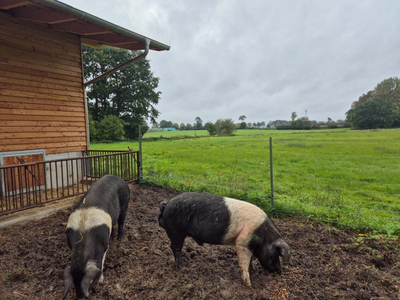 Unsere Angler Sattelschweine sind eine seltene und vom Aussterben bedrohte Nutztierrasse. Sie zeichnen sich durch Robustheit, hervorragende Muttereigenschaften und beste Fleischqualität aus. Auch hier legen wir großen Wert auf die eigene Futterproduktion. Das Grundfutter besteht aus Triticale (eine Kreuzung aus Weizen und Roggen), Weizen, Ackerbohnen als Eiweißträger, gedämpften Kartoffeln, Kleegras sowie Obst und Gemüse. Die Schweine genießen eine artgerechte Haltung mit viel Auslauf: Im nagelneuen Stall und im überdachten Auslauf, beide mit Stroh eingestreut, oder im Freien, wo sie nach Herzenslust wühlen und suhlen können.
